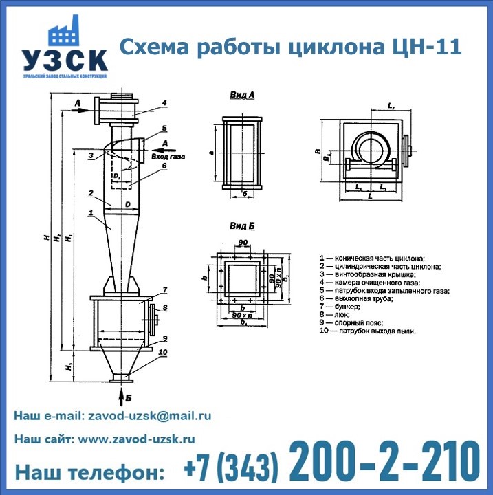 При этом ощутимой разницы в цене между универсальным и узконаправленным, подобранным в соответствии с конкретными техническими требованиями циклоном, нет. Стоимость воздухоочистительного оборудования типа циклон обусловлена маркой и толщиной стали, из которого он изготовлен, сложностью и специфичностью конструкции, наличием дополнительного оснащения (бункер, улитка и другие). При необходимости, на заводе УЗСК в Воронеже будет изготовлен циклон по индивидуальным техническим чертежам заказчика.